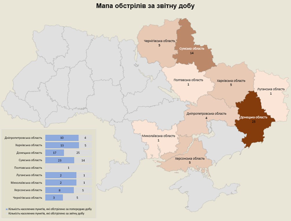 З мінометів, танків, ствольної артилерії, РСЗВ, ЗРК, ОТРК, БПЛА та тактичної авіації було атаковано 61 населений пунктів та 87 об’єктів інфраструктури.