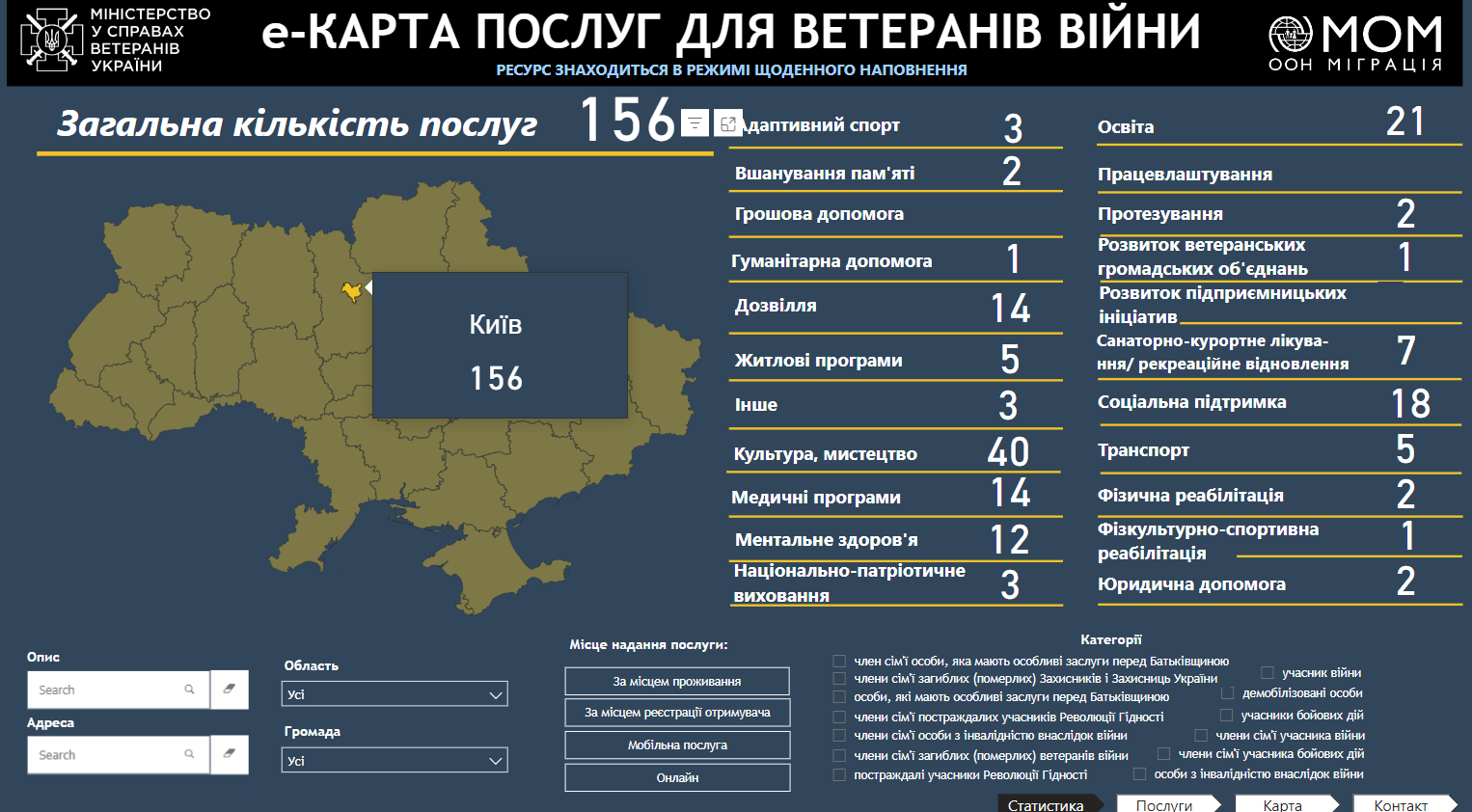 Новий сервіс - е-Карту послуг для ветеранів війни в громадах розробило та запустило Міністерство у справах ветеранів України спільно з представництвом Міжнародної організації з Міграції в Україні.