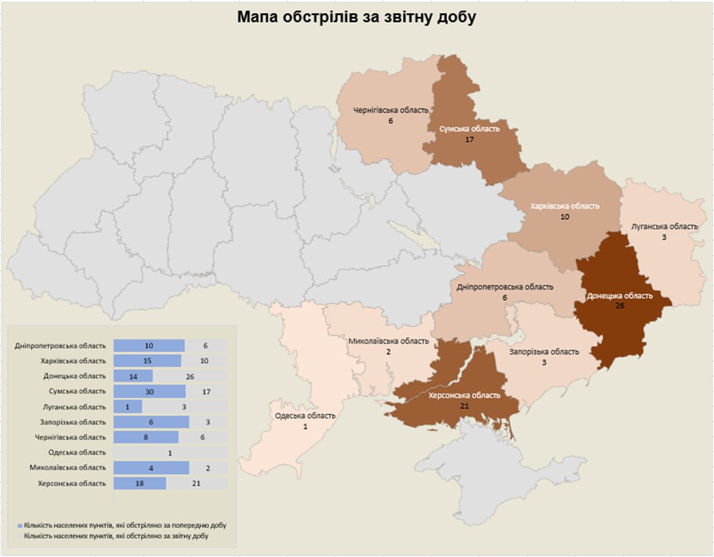 Загалом, обстрілювали із застосуванням різних видів озброєння: мінометів, артилерії, танків, РСЗВ, ЗРК, ОТРК, БПЛА, тактичної авіації. Атаковано 95 населених пунктів та 231 об’єкт інфраструктури.