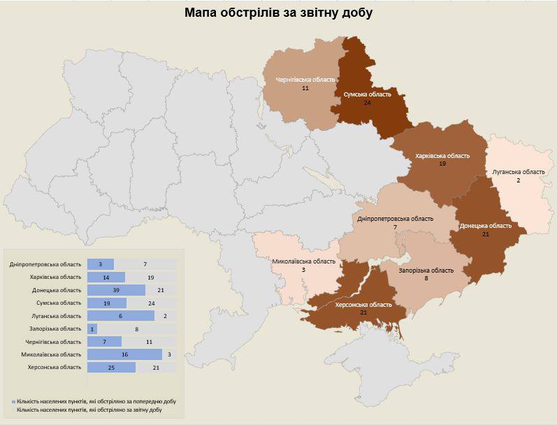 Як повідомляється, протягом минулої доби російські війська обстріляли з мінометів, танків, артилерії, РСЗВ, БПЛА, ЗРК та тактичної авіації територію дев’яти областей України.