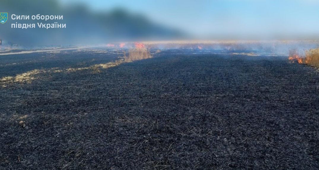 Про це повідомляють Сили оборони півдня України. Внаслідок влучання зайнялось пшеничне поле. Пожежу наразі ліквідовують вогнеборці.