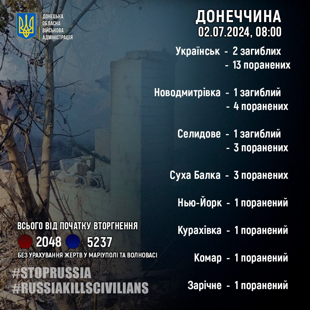 «росія вбиває цивільних! За 1 липня росіяни вбили 4 жителів Донеччини: 2 в Українську, 1 в Новодмитрівці і Селидовому», — йдеться у повідомленні.