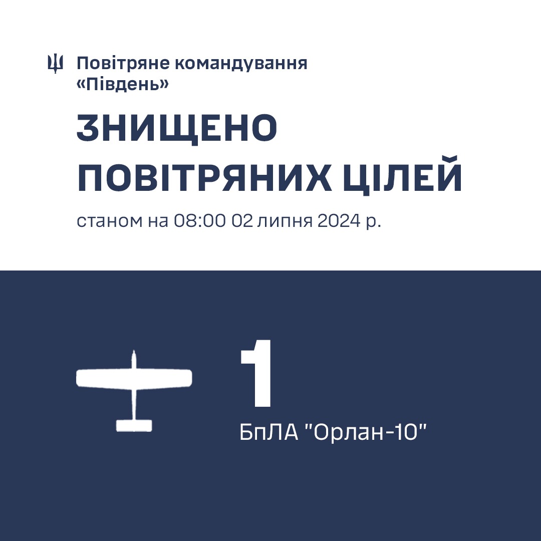 «Упродовж минулої доби 1 липня 2024 року протиповітряною обороною півдня України знищено розвідувальний безпілотник «Орлан-10», — йдеться у дописі.
