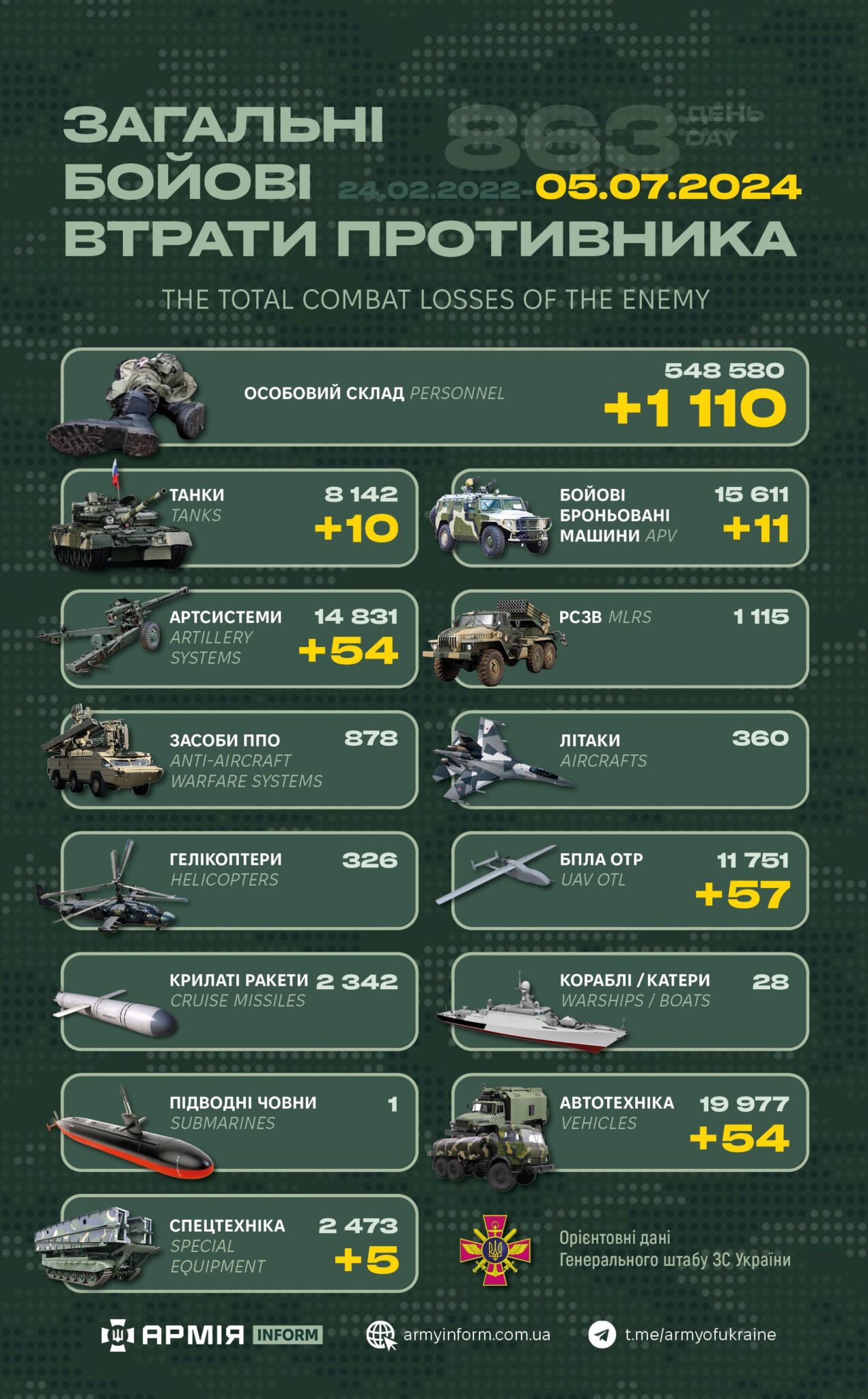 Як повідомляють в Генеральному штабі ЗСУ, загальні бойові втрати противника з 24.02.22 по 05.07.24 орієнтовно склали: