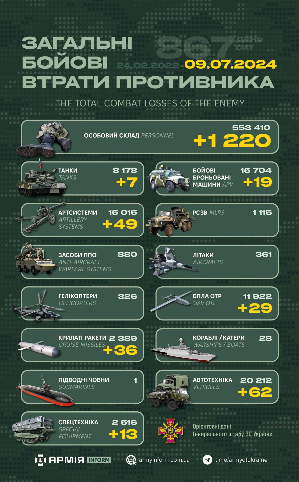 Загальні бойові втрати противника з 24.02.22 по 09.07.24 орієнтовно склали: