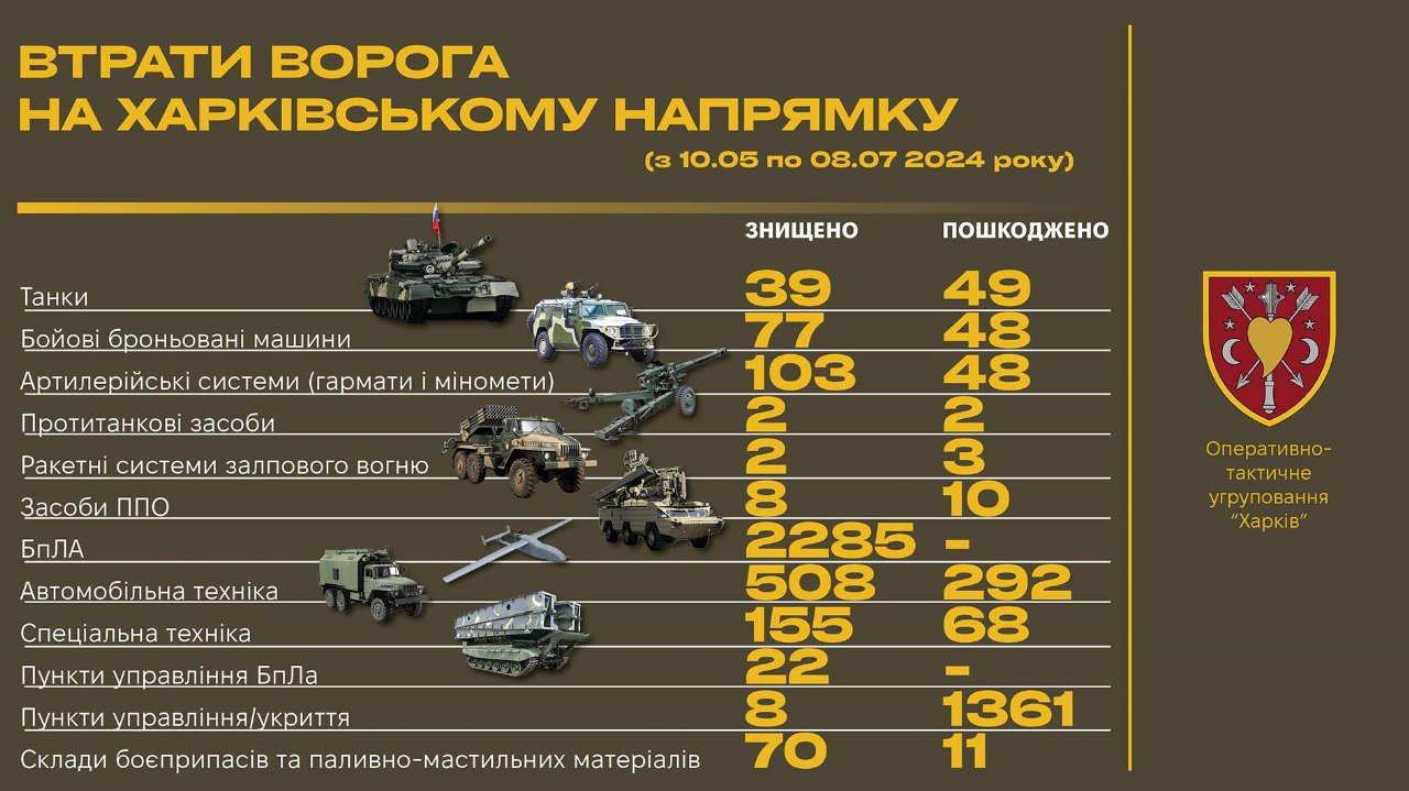 Загальні втрати ворожої техніки на Харківському напрямку — в зоні відповідальності ОСУВ «Хортиця» за період з 10.05.2024 по 08.07.2024 становлять: