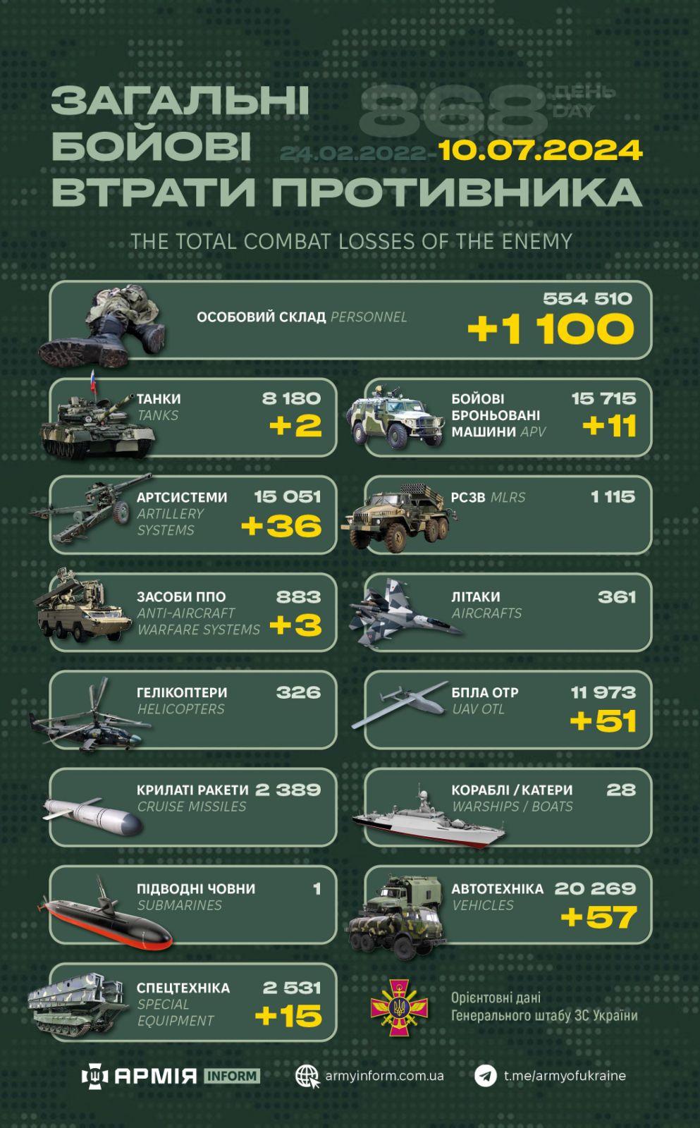 Генеральний штаб Збройних Сил України оприлюднив інформацію щодо загальних бойових втрат противника з 24.02.22 по 10.07.24.