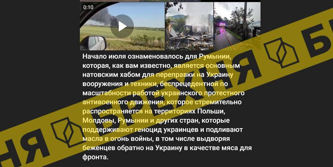 Для ілюстрації пожежі на «складі з натівським озброєнням» пропагандисти використали фото з реальної події у селі Слетіоара в Румунії. Але, як повідомляли місцеві ЗМІ, там горів не військовий склад, а два будинки і три господарські будівлі.