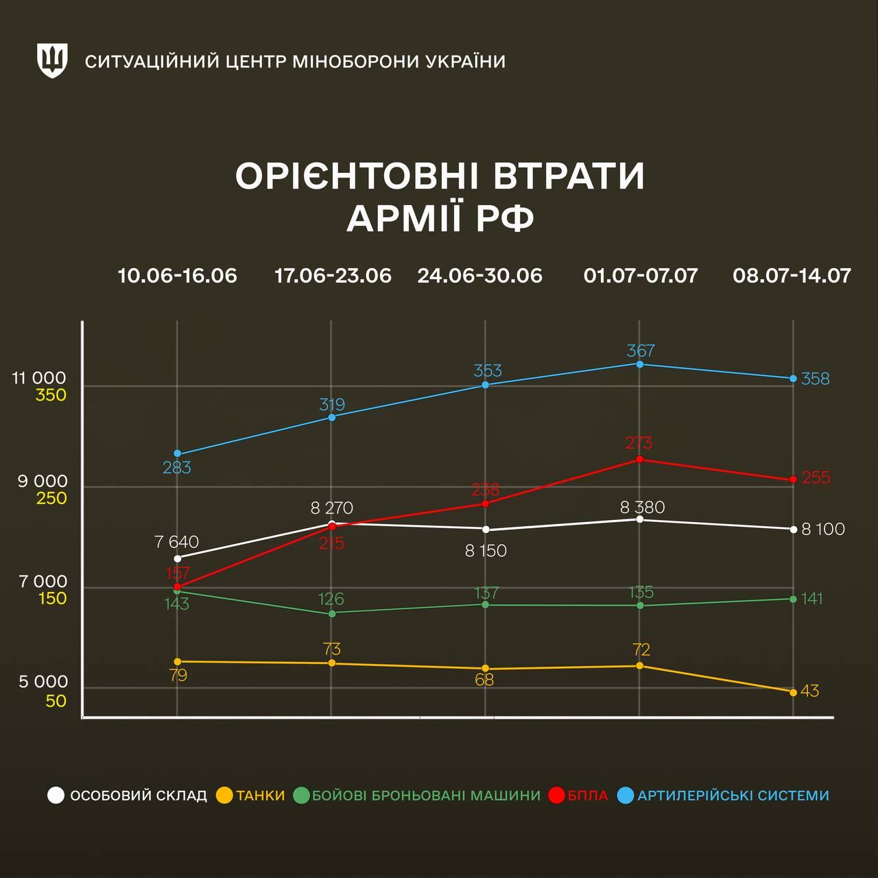 За минулий тиждень (з 8 по 14 липня) Сили оборони України знищили 8100 російських окупантів.