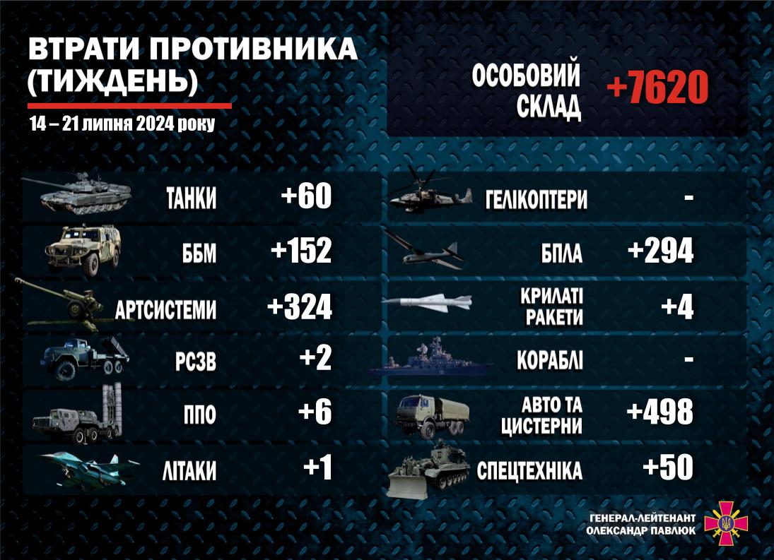 За тиждень з 14 по 21 липня 2024 року втрати противника склали близько 7620 осіб особового складу.