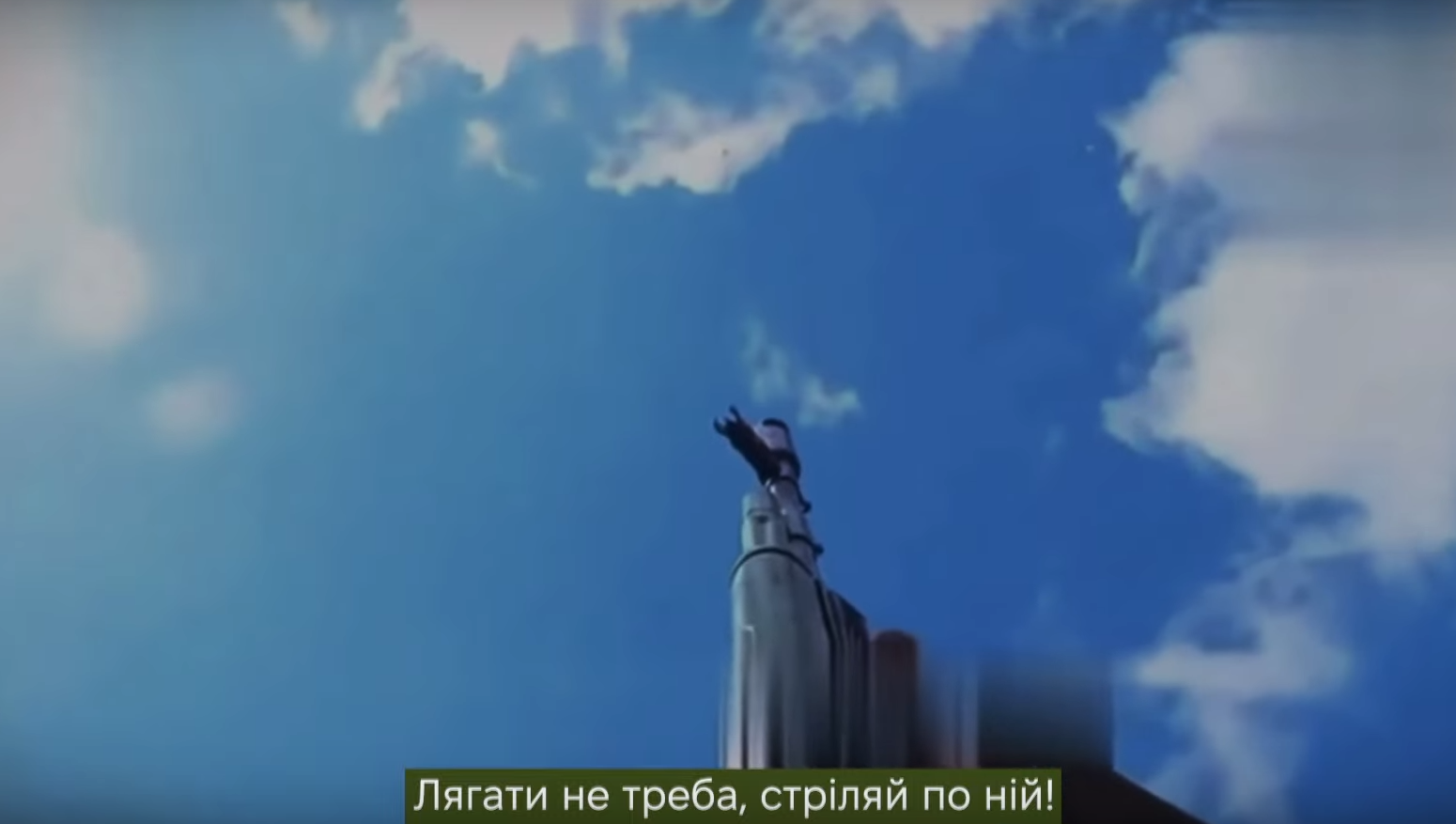 Потім він чує наближення дронів і згадує про існування янголів. Хтось дуже розумний по рації підказує загарбнику, що лягати не треба, краще стріляти по дрону.