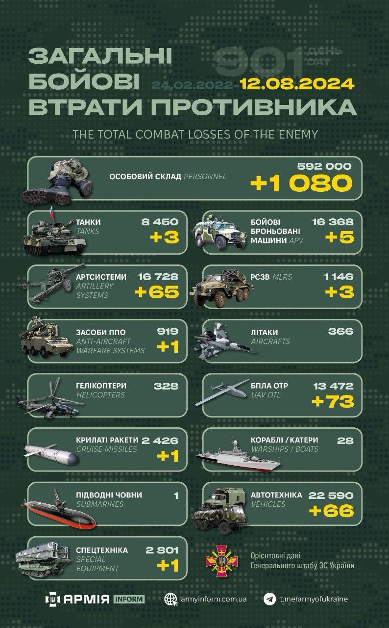 Загальні бойові втрати противника з 24.02.22 по 12.08.24 орієнтовно склали: