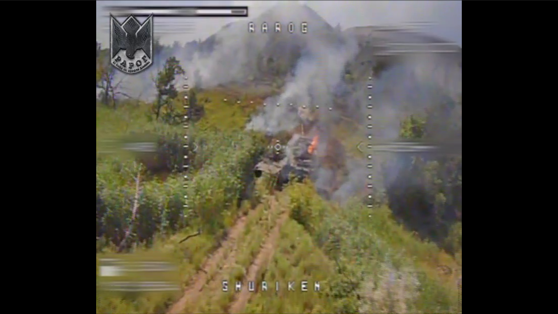 Пілоти «Рарога» спочатку уразили танк, потім добили його і підбили БМП. В результаті бронетехніка загарбників добре запалала.