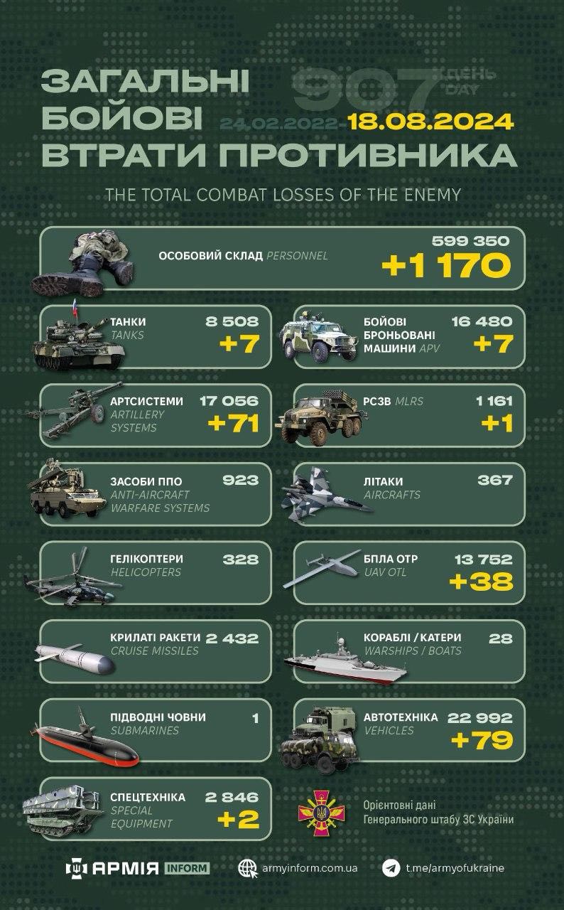 Загальні бойові втрати противника з 24.02.22 по 18.08.24 орієнтовно склали: