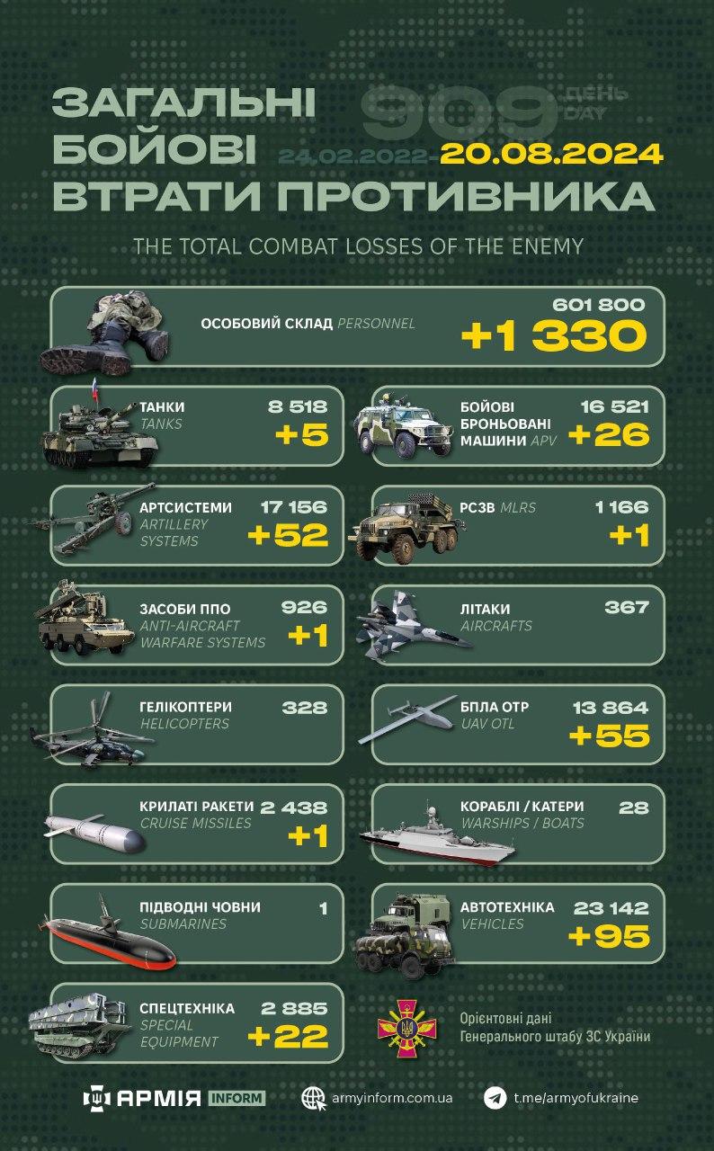 Загальні бойові втрати противника з 24.02.22 по 20.08.24 орієнтовно склали: