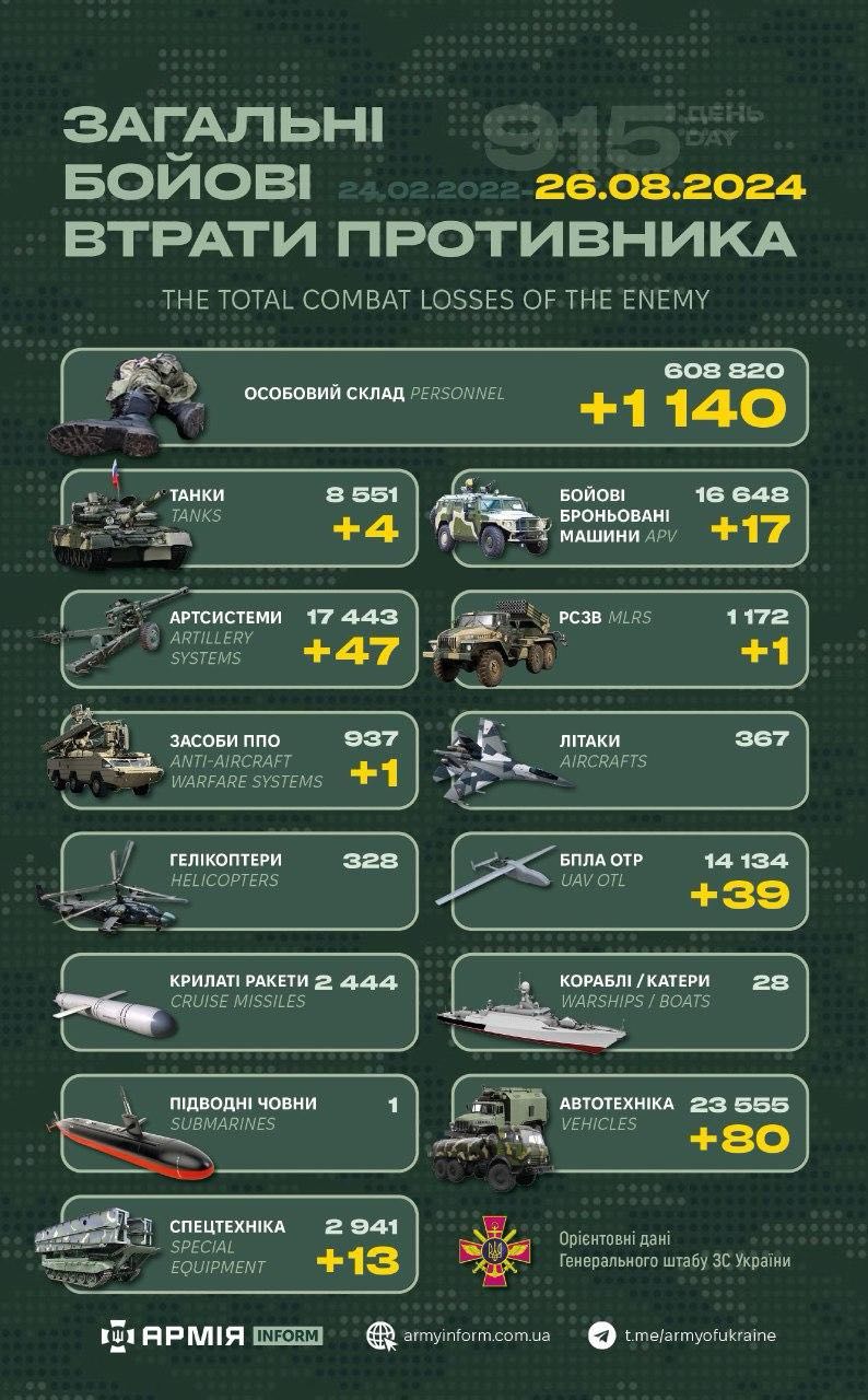 Загальні бойові втрати противника з 24.02.22 по 26.08.24 орієнтовно склали: