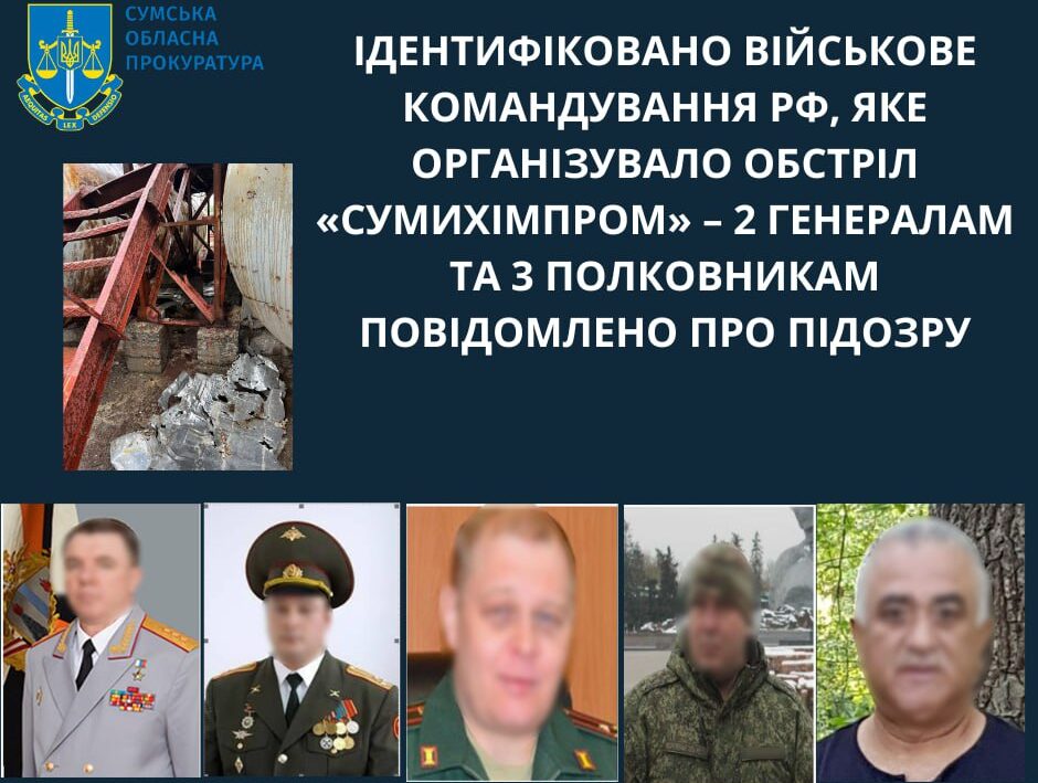 Ідентифіковано та заочно повідомлено про підозру двом генералам та трьом полковникам командного складу підрозділів Західного військового округу зс рф, які в порушення законів та звичаїв війни спланували обстріл аміачного відділення цеху ПАТ «Сумихімпром».