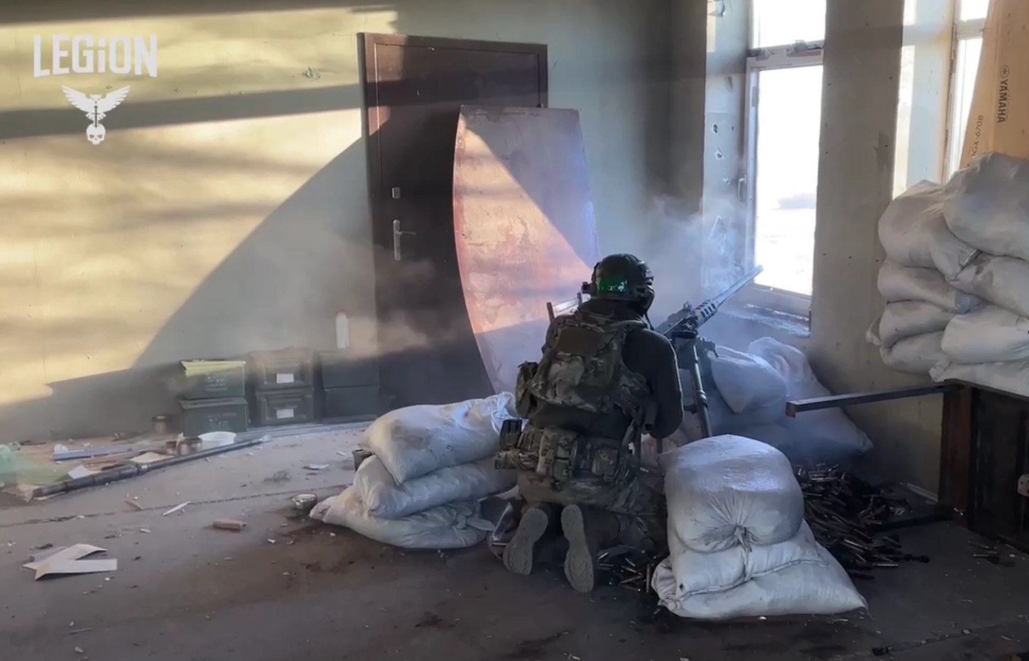 Воїни групи «Athena» Міжнародного легіону Головного управління розвідки Міністерства оборони України працюють з кулемета Browning M2 на одному з напрямків фронту.