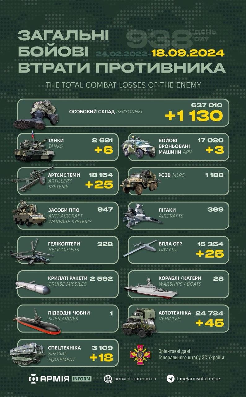 Джерело: Генеральний штаб Збройних Сил України станом на 18.09.24.