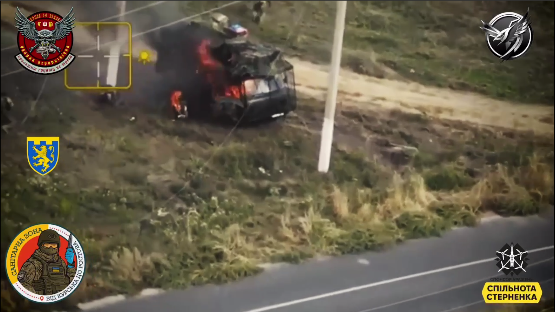 Бійці групи ударної аеророзвідки «Крила до пекла» уразили бусик «уаз», який перевозив російських штурмовиків. Машина загорілася разом з пасажирами.