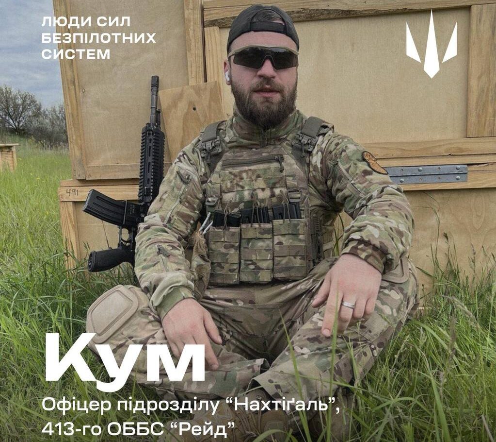 Сергій з позивним Кум, офіцер підрозділу «Нахтіґаль», 413 батальйону «Рейд» Сил безпілотних систем ЗСУ зі своїми побратимами брав участь в операціях, які призвели до сумарних втрат ворога у понад $590 млн.