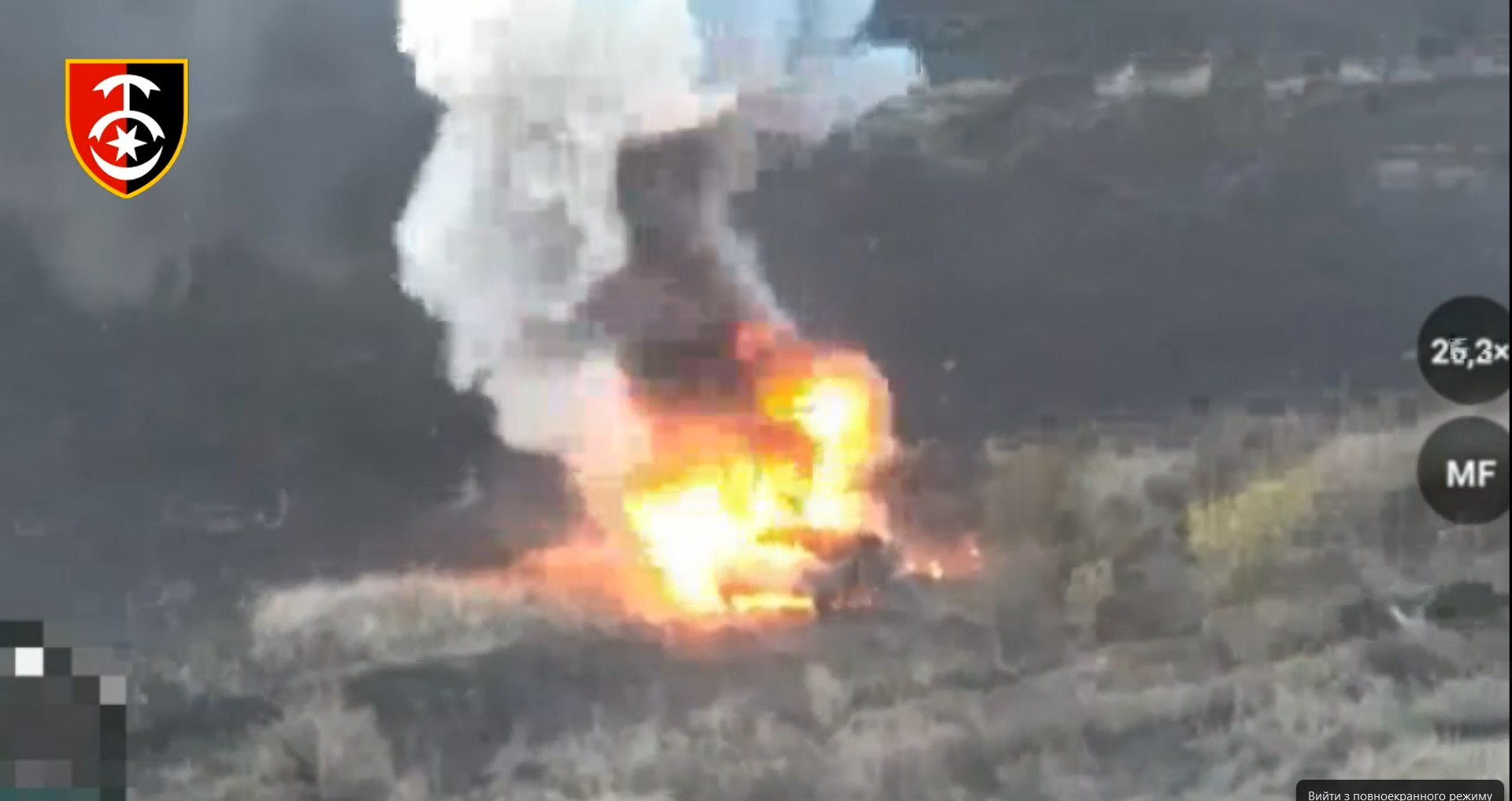 Бійці 30 механізованої бригади імені князя Костянтина Острозького показали кадри першого знищення ворожого танка за допомогою дрона з термічним боєприпасом.