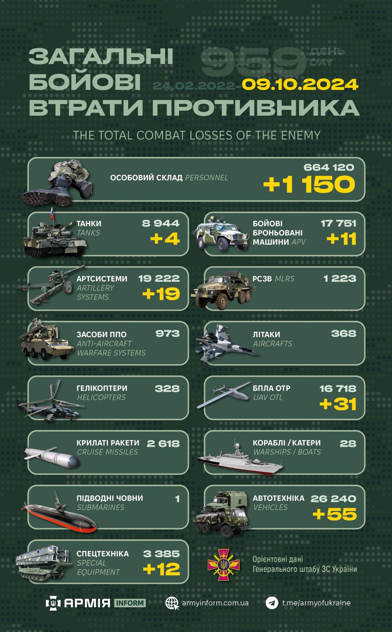 Загальні бойові втрати противника з 24.02.22 по 09.10.24 орієнтовно становлять: