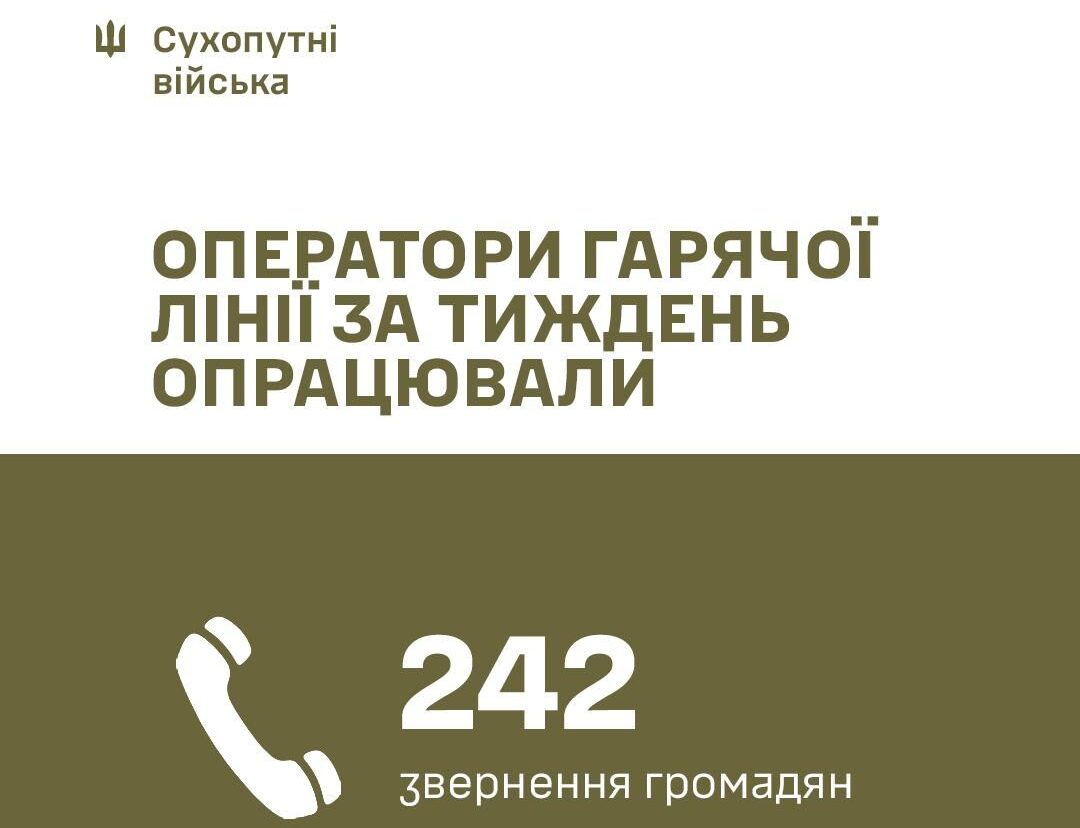 За тиждень роботи (з 1 по 6 жовтня) фахівці гарячої лінії з питань мобілізації та обліку військовозобовʼязаних, а також Call-центру Командування Сухопутних військ опрацювали 242 звернення громадян.