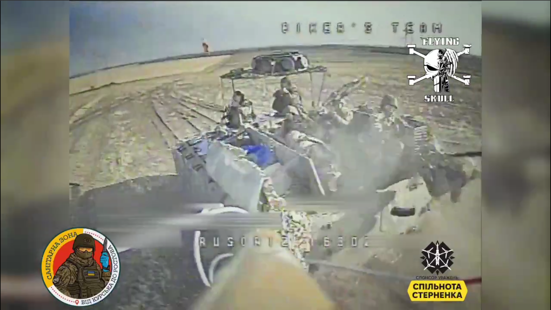 «На Курщині росіяни на бронетехніці їхали на штурм. Вчепили РЕБ. Не допомогло», — прокоментували відео «Крила до пекла».