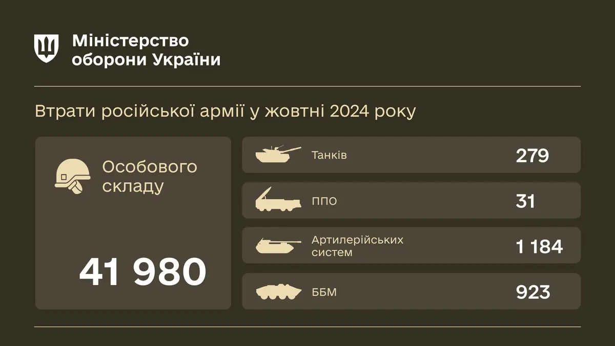 У жовтні Сили оборони також знищили та уразили 279 танків ворога. Це умовно 9 танкових батальйонів (в танковому батальйоні 31 машина). Орієнтовна вартість такої кількості танків щонайменше 400 млн доларів США.