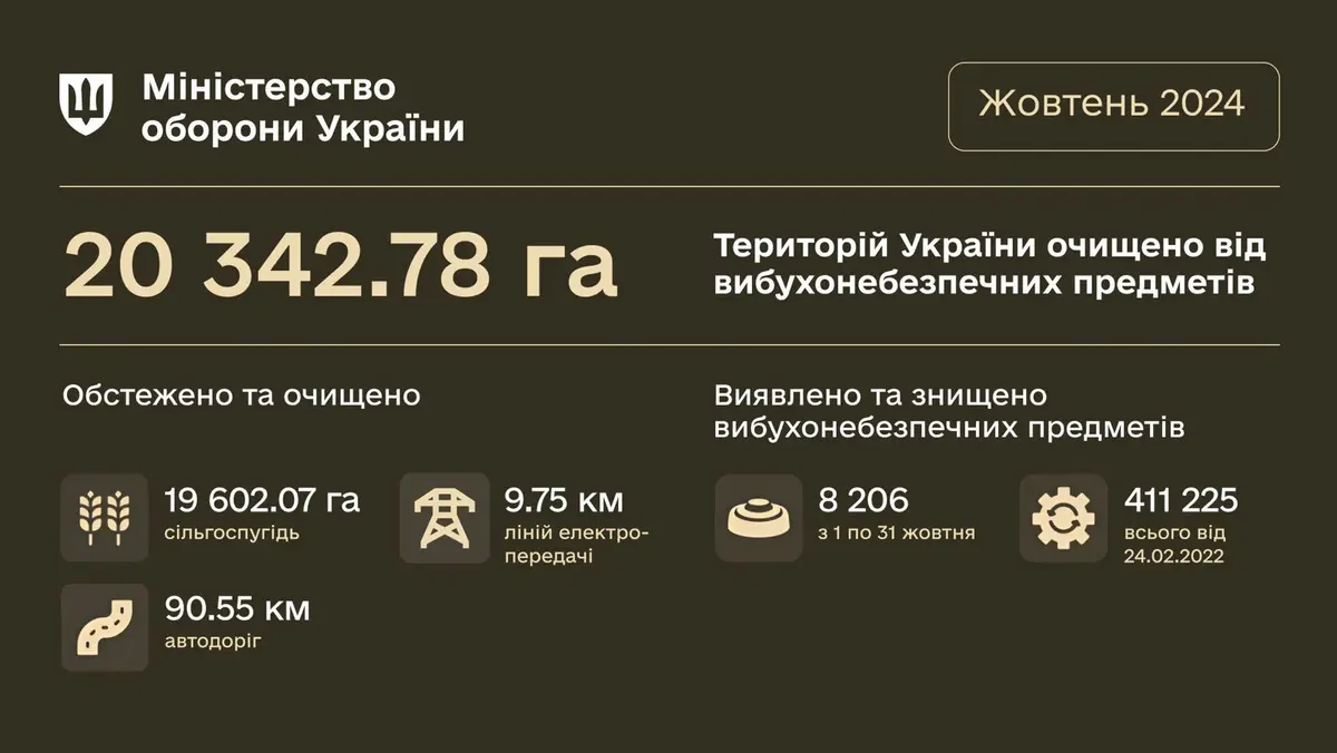 Протягом жовтня 2024 року підрозділи з розмінування Міністерства оборони України очистили 20 342.78 га територій, забруднених вибухонебезпечними предметами внаслідок збройної агресії рф.