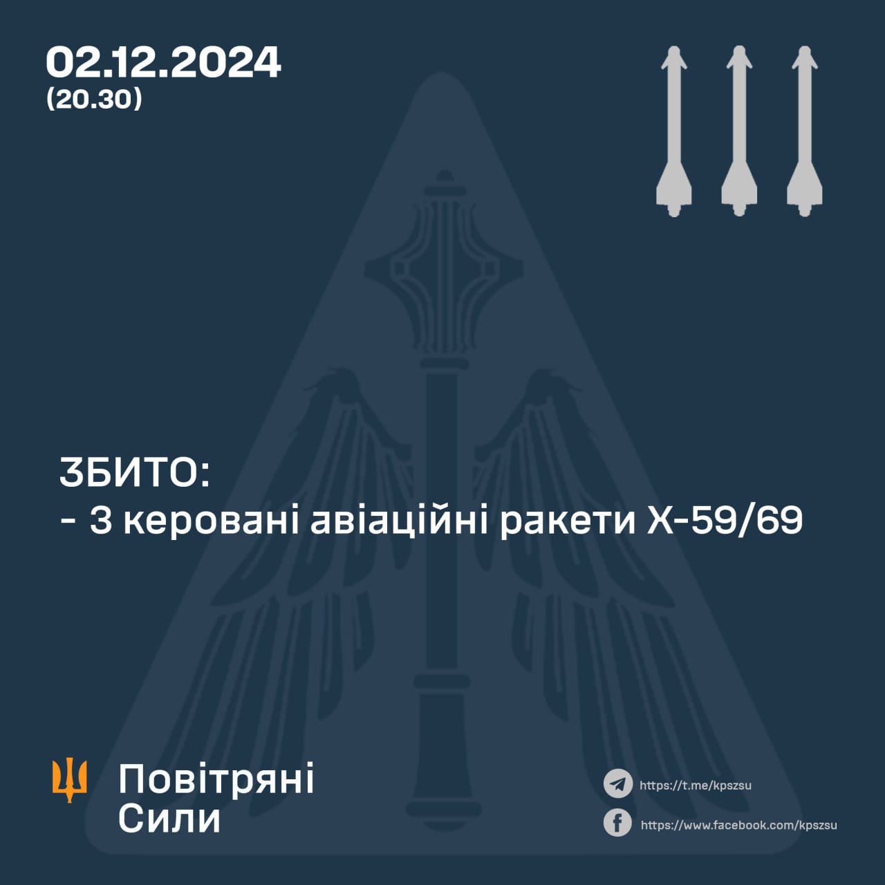 Про це повідомили увечері 2 грудня Повітряні Сили ЗСУ.