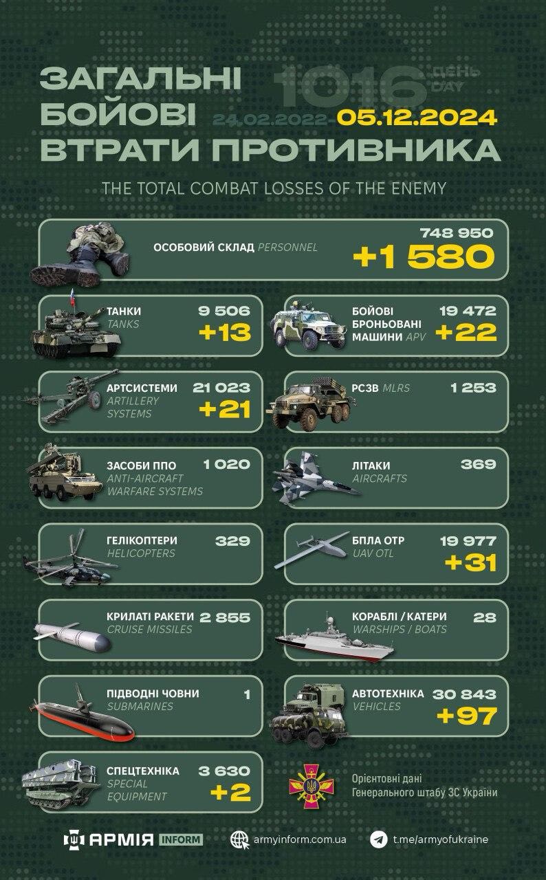Загальні бойові втрати противника з 24.02.22 по 05.12.24 орієнтовно становлять: