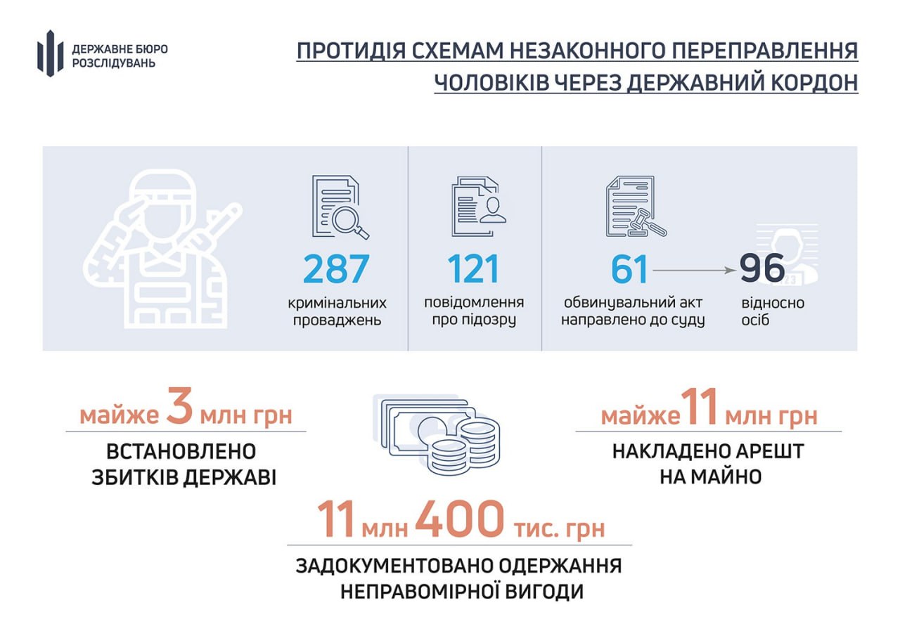 У цьому році працівники ДБР розслідували 287 кримінальних проваджень щодо незаконного переправлення осіб через держкордон. Про підозру було повідомлено 121 особі, направлено до суду 61 обвинувальний акт щодо 96 осіб.