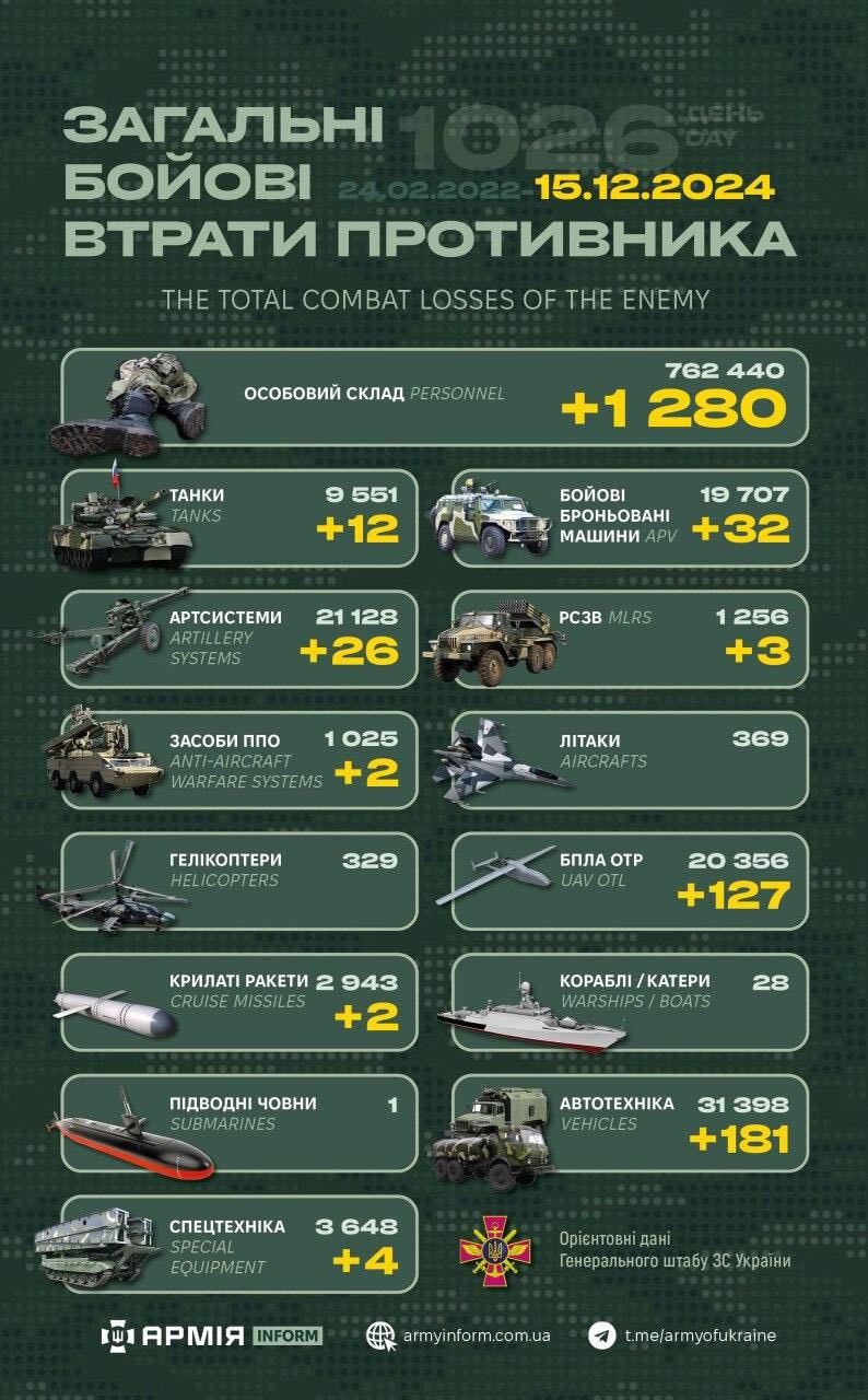 Загальні бойові втрати противника з 24.02.22 по 15.12.24 орієнтовно становлять:
