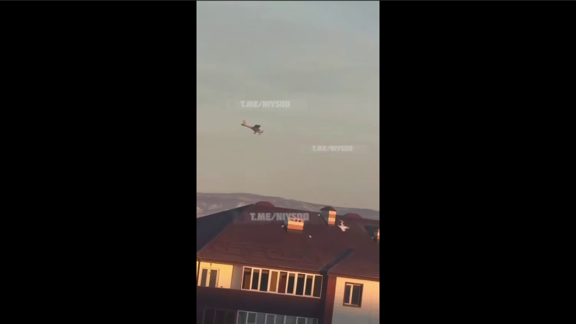 На відео видно БПЛА літакового типу, який летить над містом, не дивлячись на спроби збиття зі стрілецької зброї.