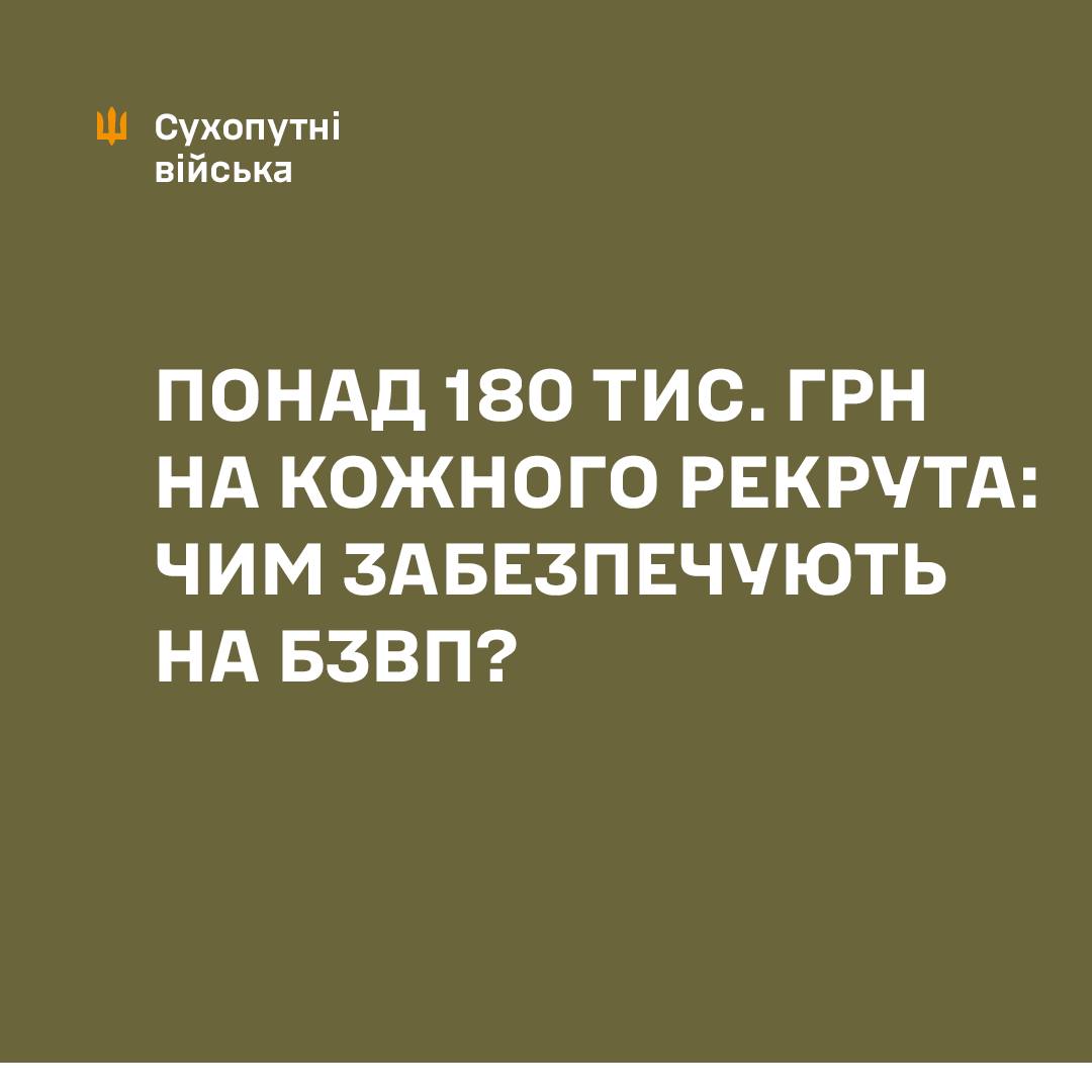 За даними Сухопутних військ, сьогодні загальна вартість забезпечення рекрута на час проходження БЗВП становить 180 804 гривні. З них 99 тисяч гривень виділено на обмундирування, 75 727 гривень — на забезпечення боєприпасами, а 5 681 гривня — на продовольство.
