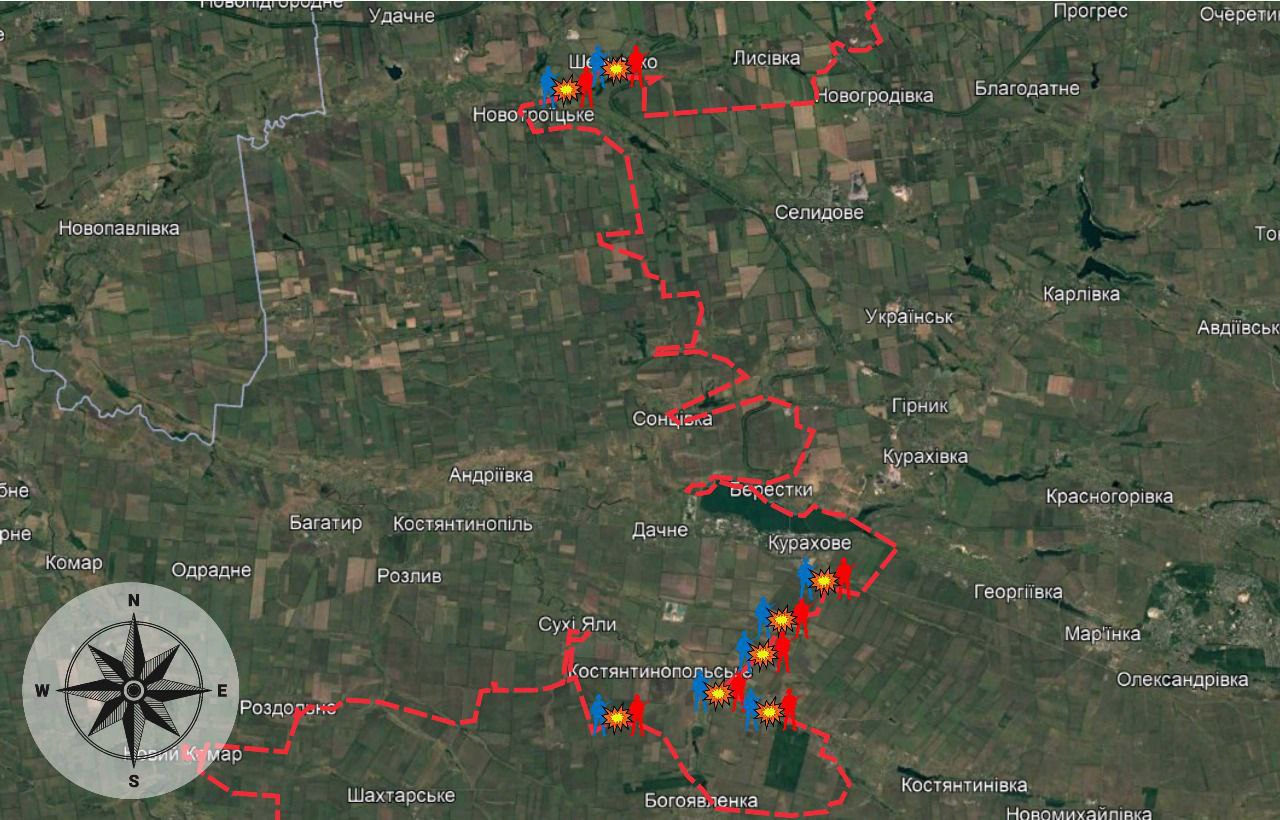 Спроби наступу зафіксовані в районах населених пунктів Шевченко, південніше Сторожевого, південно-східніше Успенівки, східніше Трудового, а також на околицях Дальнього і південній частині Курахового. В усіх напрямках ворог зазнав значних втрат і був змушений відступити.