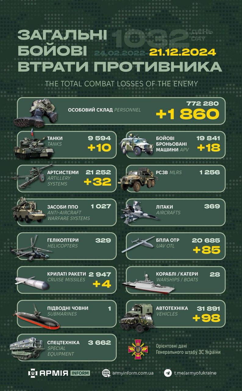 Загальні бойові втрати противника з 24.02.22 по 21.12.24 орієнтовно становлять: