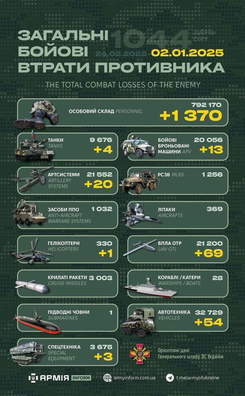 Загальні бойові втрати противника з 24.02.22 по 02.01.25 орієнтовно становлять: