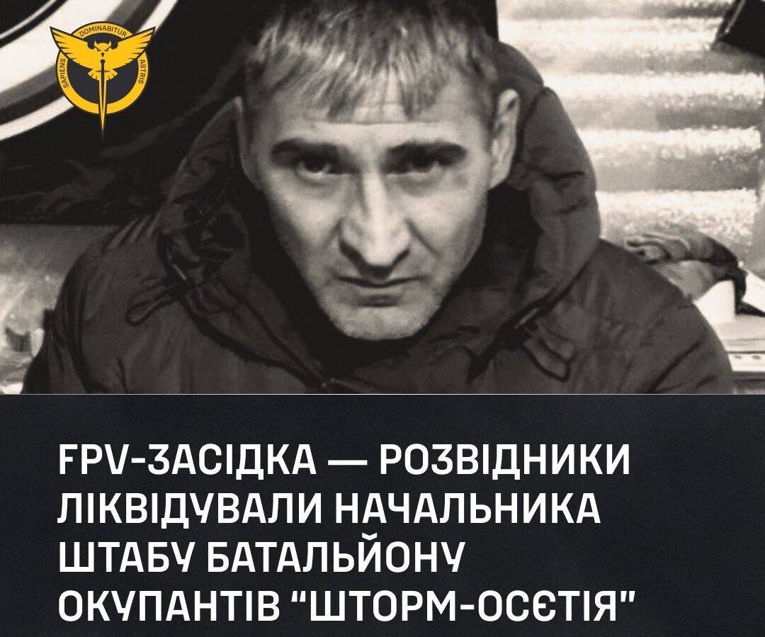 На трасі Василівка-Токмак воїни розрахунку FPV підрозділу активних дій ГУР «Кракен» ліквідували начальника штабу батальйону “шторм.осєтія” (штурмовий підрозділ в складі 429 мотострілецького полку зс рф) сєрґєя «кама» мєльнікова та його водія.