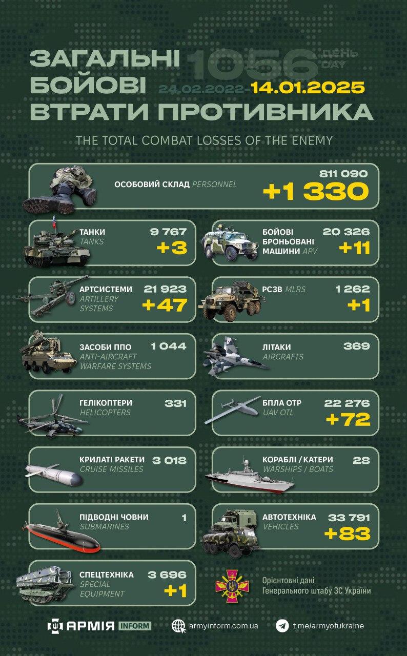 Загальні бойові втрати противника з 24.02.22 по 14.01.25 орієнтовно становлять:
