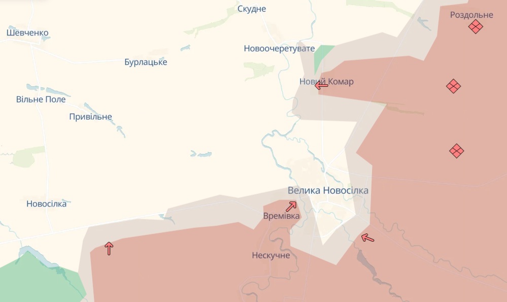 Окупаційні російські війська продовжують активні штурмові дії в районі населеного пункту Велика Новосілка на Донеччині.