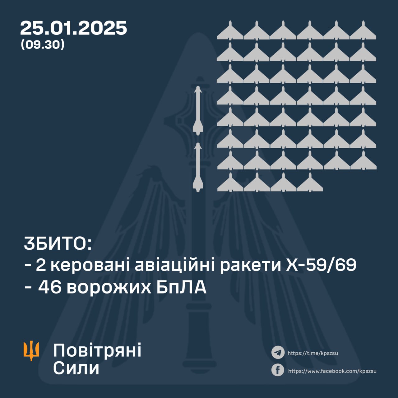 «Станом на 09.30 підтверджено збиття двох керованих авіаційних ракет Х-59/69 та 46-ти ударних БпЛА типу «Shahed» та безпілотників інших типів у Одеській, Харківській, Полтавській, Сумській, Київській, Черкаській, Донецькій, Запорізькій, Дніпропетровській, Хмельницькій та Кіровоградській областях», ― йдеться у повідомленні.