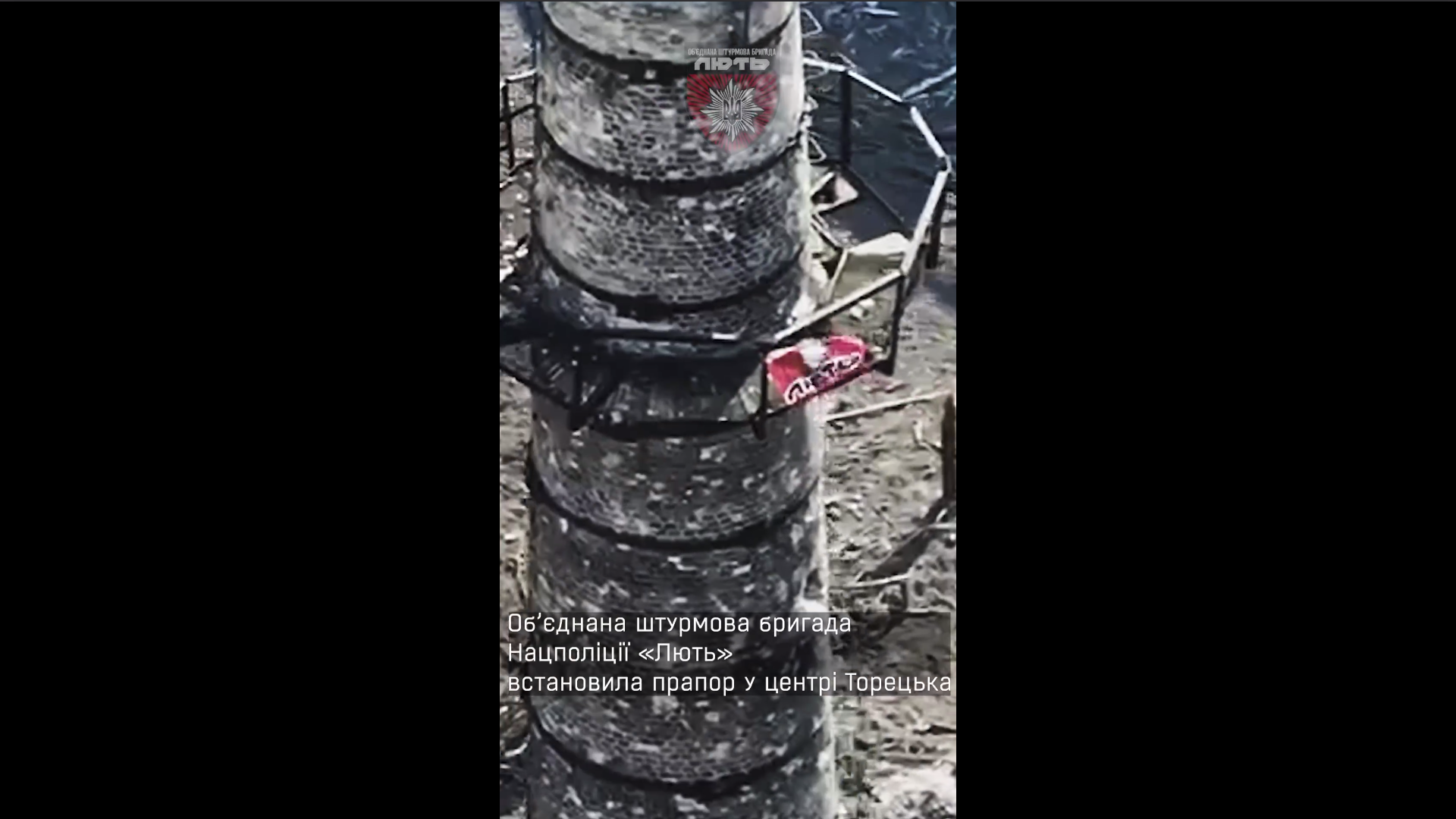 Прапор Об’єднаної штурмової бригади Нацполіції «Лють» був встановлений на цегляній трубі у Торецьку.