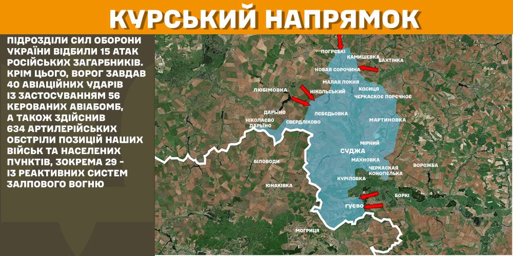 В операційній зоні на Курщині підрозділи Сил оборони України вчора відбили 15 атак російських загарбників. Крім цього, ворог завдав 40 авіаційних ударів із застосуванням 56 керованих авіабомб, а також здійснив 634 артилерійських обстріли позицій наших військ та населених пунктів, зокрема 29 — із реактивних систем залпового вогню.