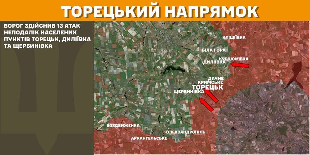 На Торецькому напрямку ворог здійснив 13 атак неподалік населених пунктів Торецьк, Диліївка та Щербинівка.