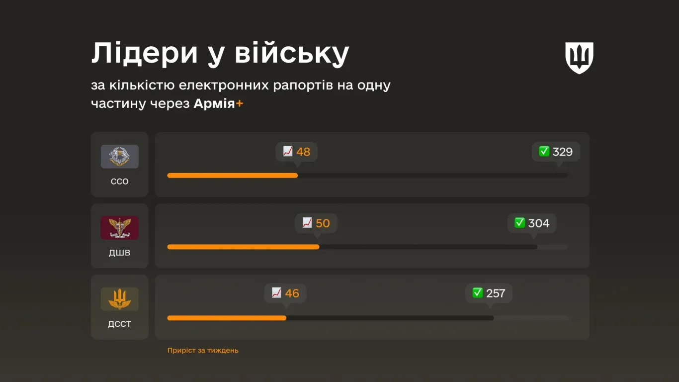 Найбільшу кількість рапортів на частину обробили у Силах спеціальних операцій (ССО), Десантно-штурмових військах (ДШВ) та Державній спецслужбі транспорту (ДССТ). У середньому кожна з їхніх інтегрованих частин обробила таку кількість запитів: