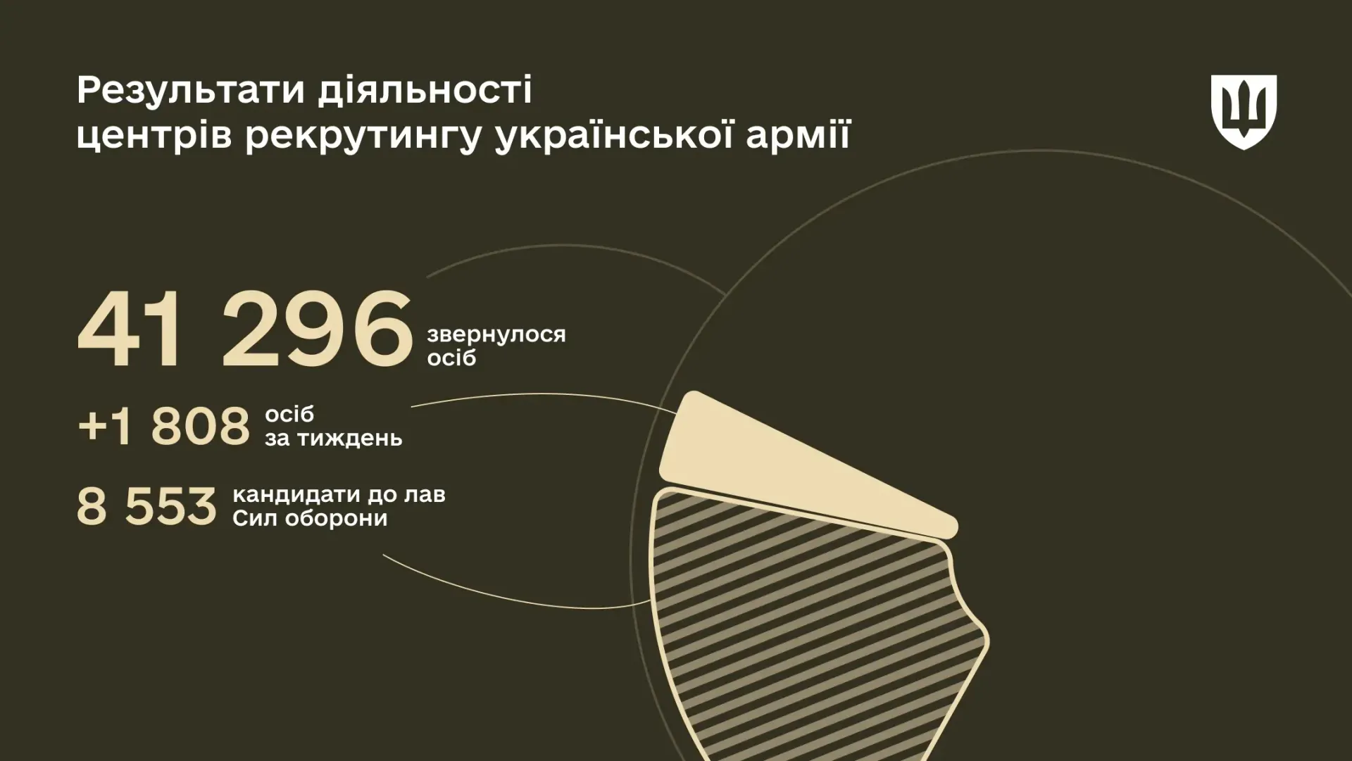 Від лютого 2024 року до центрів рекрутингу української армії звернулися 41 296 громадян, зокрема, 1 808 — упродовж минулого тижня.