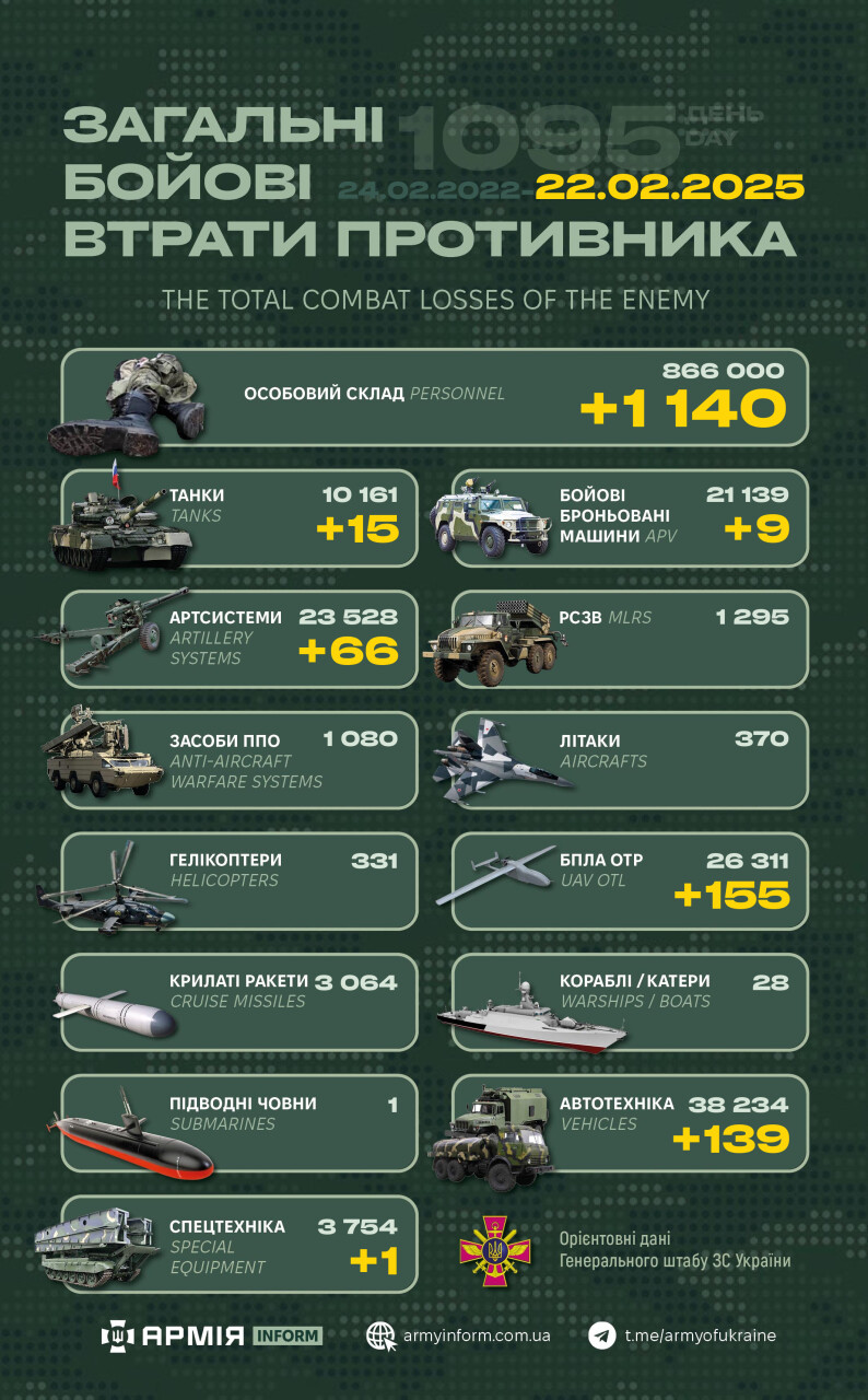 Загальні бойові втрати противника з 24.02.22 по 22.02.25 орієнтовно становлять: